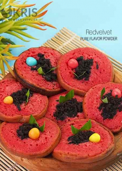 Redvelvet Bubuk perisa kemasan sachet, rasa redvelvet dan aroma redvelvet sangat enak, bubuk perisa rasa redvelvet ini bisa dibuat makanan redvelvet seperti kue cubit, dan kue dadar gulung tanpa topping atau bisa juga dibuat dengan topping lainnya.